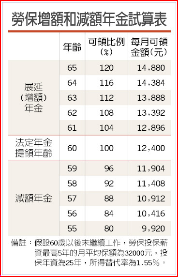 【中國時報/陳怡慈/台北報導】2008.09.29 國民年金(簡稱「國保」)、勞保年金(簡稱「勞保」)將於十月一日、明年一月一日上路,五十五歲到六十五歲的「請領一族」問題最多,專家提醒勿盡信口訣,一定要動手試算,而一旦選定,經勞保局核付後就不得再變更請領方式。 以勞保老年給付為例,只要保險年資滿十五年,就可以從五十五歲開始「提前」領年金,但是,每月領到的錢會被打八折,若請領方式 選錯了還想再更改,可是門兒都沒有。