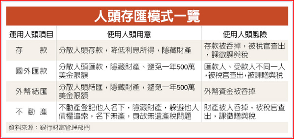 【工商時報/李國煌/台北報導】2008.08.27 陳致中夫婦涉及擔任人頭洗錢,案情一路升高,金融世界人頭滿天飛,其中,銀行存款、國外匯款、外幣結匯,三大存匯項目中,部分大戶考慮稅負、法令限制因素,透過人頭辦理存匯、節稅大鬥法。