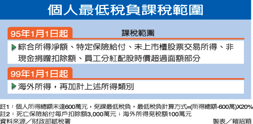 【經濟日報╱記者陳美珍/台北報導】2008.09.26 行政院正式核定,個人海外所得全年超過新台幣100萬元時,自99年1月1日起,須併入最低稅負計算課徵20%所得稅。財政部表示,凡是未曾向中華民國繳納稅款的海外所得,包括證券投資、土地交易、銀行存款利息等,全部都在課稅之列。
